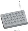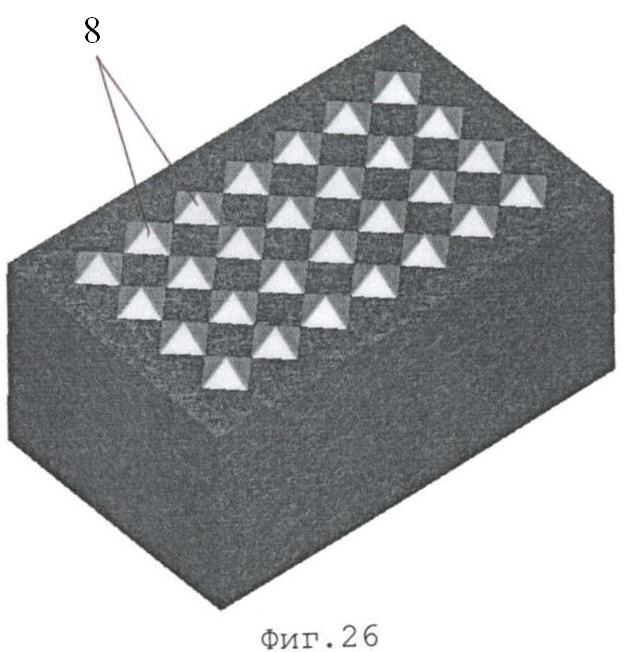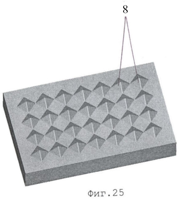 Примеры выполнения элементов оснастки для изготовления шва строительного раствора и строительного конструктивного элемента, содержащего выступы 8, приведены на фиг.25 и фиг.26 соответственно. Аналогичным может быть выполнение элементов оснастки для изготовления шва строительного раствора и строительного конструктивного элемента с инициирующими конструктивными элементами в виде впадин.