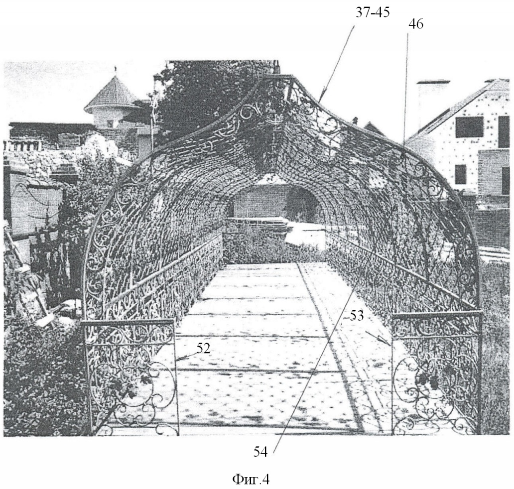 арки соединяют с волнообразными профилями проволочного волнообразного проката (54), с оппозитным расположением проката (54), которым составляют сетчатое покрытие арок (37-45), с прикрепленными к ним ручной сваркой виноградными листьями, выполненными из стального листового проката с предварительной разметкой центрации каждого отдельного привариваемого элемента декоративной беседки, где по торцам (25 и 26) установлены оппозитно расположенные части декоративных секций рамок (53 или 52). |