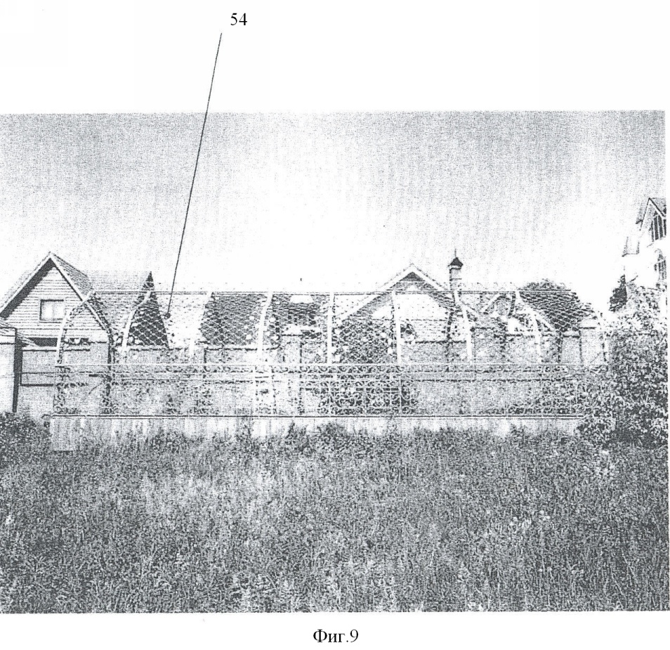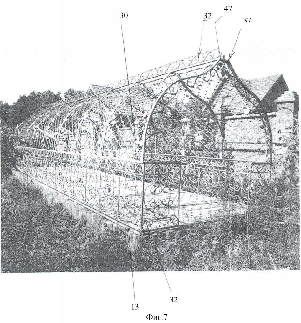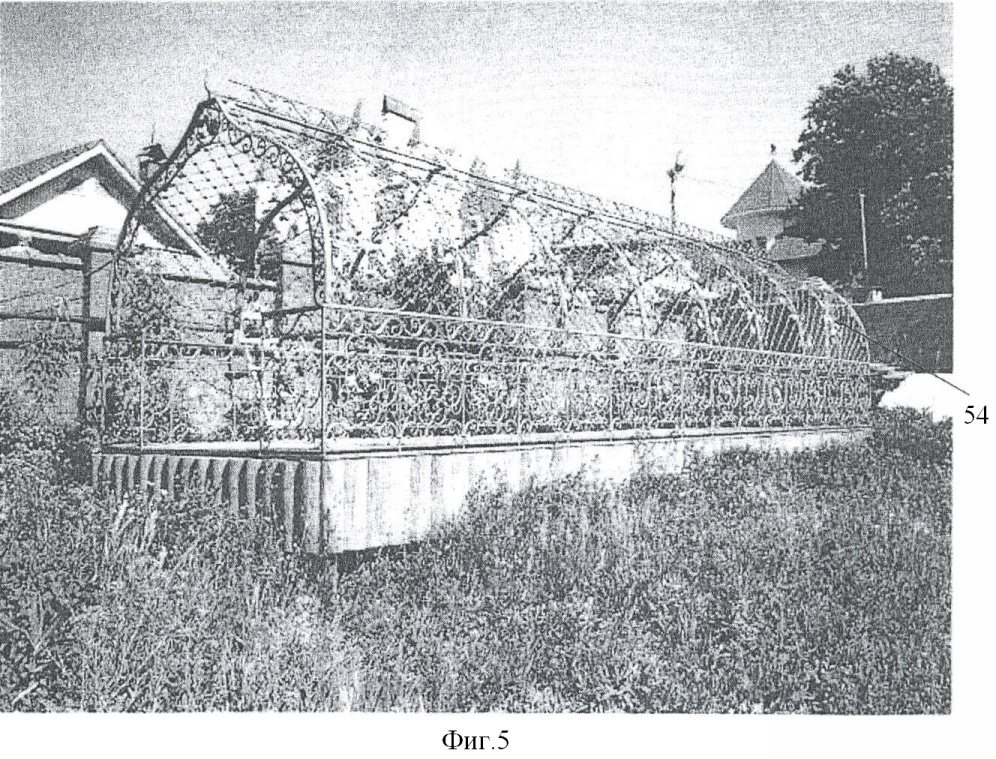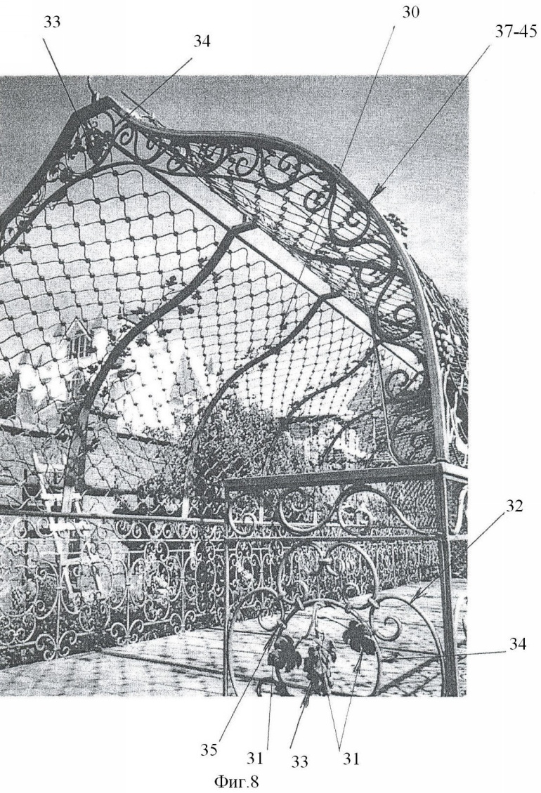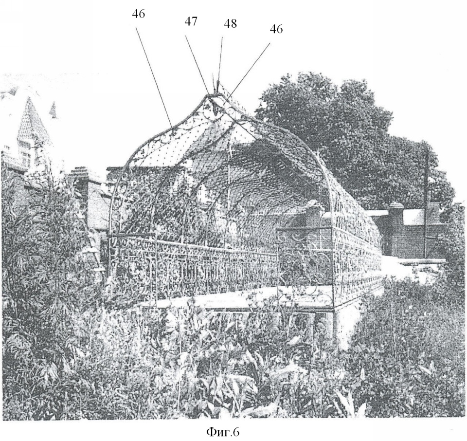 изготовляют арки (37-45), причем две из них (37 и 45), расположенные со стороны торцов (25 и 26), снабжают декоративным контуром (46), состоящим из сопрягаемых между собой веток лозы; |