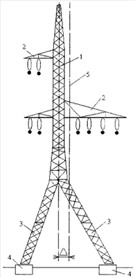 Для несимметричного выполнения по расположению опоры ось линии электропередачи проходит – плоскость 5 симметрии смещена относительно вертикальной плоскость симметрии опоры на . Для компенсации несимметричности одна из наклонных стоек располагается под большим углом к оси вертикальной стойки 1, чем другая наклонная стойка.