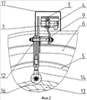 При нормальном цикле спуско-подъемных операций подпружиненный относительно упора 2 поворотный рычаг 1 находится в вертикальном положении, а его верхний конец, находящийся в зоне установки индуктивного выключателя 4, «перекрывает» его, что соответствует положению «выключено». В случае подъема верхней подвесной части талевой системы к контрольной отметке (в опасную зону) контрольный виток 13 при наматывании на барабан 5 каната начинает контактировать со сферическим роликом 16. При дальнейшем наматывании каната на барабан контрольный виток 13, воздействуя на ролик 16, начинает отводить поворотный рычаг 1. Поворотный рычаг 1 поворачивается, и верхний конец рычага выходит из зоны действия индуктивного выключателя 4 – «открывает» его, что соответствует положению «включено» (на фиг.1 показано пунктирной линией). Индуктивный выключатель 4 выдает в систему управления приводом и торможения барабаном 5 сигнал, под действием которого происходит отключение привода лебедки с одновременным включением тормоза барабана. Подъем талевого блока прекращается.
