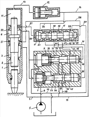Устройство ударного действия состоит из корпуса 1, в направляющих которого подвижно установлен поршень-ударник 2, совместно с корпусом образующий камеру 3 холостого хода, постоянно по линии 4 связанную с источником 5 рабочей жидкости под давлением (насосом), камеру 6 рабочего хода, которая посредством расположенного в расточке корпуса двухпозиционного клапана 7 периодически сообщается с напорной 8, а посредством аналогичного клапана 9 – со сливной 10 магистралями. Задний конец поршня-ударника 2 постоянно размещен в газовой камере 11 корпуса, заполненной сжатым газом. Для компенсации неравномерности расхода жидкости и накопления энергии в процессе холостого хода ударника служит гидропневматический аккумулятор 12, газовая полость которого по линии 13 постоянно сообщается с газовой камерой 11, а гидравлическая полость – по линии 14 с насосом 5. Управление положением клапанов 7 и 9 осуществляется с помощью золотникового распределителя 15 в зависимости от положения его золотника 16, имеющего три ступени. Крайняя левая 17 (по чертежу) его ступень имеет наибольший диаметр, а противоположная правая ступень 18 имеет наименьший диаметр. Средняя ступень 19 золотника 16 оснащена распределительными канавками и сопряжена с внутренней поверхностью корпуса золотникового распределителя 15. Со стороны левой ступени 17 золотника 16 в корпусе распределителя 15 выполнена коаксиальная цилиндрическая полость 20 с диаметром, равным диаметру ступени 17, и по линии 21 сообщенная с коаксиальной расточкой 22 камеры 6 рабочего хода. К полости 20 примыкает цилиндрическая расточка 23, каналом 24 сообщенная с напорной магистралью 14 и имеющая диаметр больше диаметра ступени 17 золотника 16. Со стороны ступени 18 золотника в корпусе распределителя 15 выполнена коаксиальная цилиндрическая полость 25 с диаметром, равным диаметру ступени 18, и каналом 26 сообщенная с нижней торцевой коаксиальной расточкой 27 камеры рабочего хода 6.