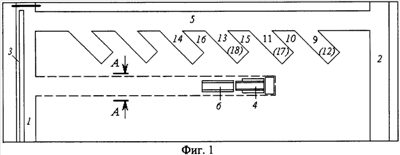 После выемки заходки 12 у почвы пласта комбайн 4 перегоняют на почву слоя у кровли пласта и в том же порядке вынимают уголь в заходках 13 и 14, оставляя подзавальные целики 15 и 16. Затем выполняют следующий наклонный съезд, углубляя следующую часть камеры 5 до почвы пласта, и вынимают уголь в заходках 17 и 18. И так до тех пор, пока не будет отработана часть выемочного поля, прилегающая к камере 5 со стороны падения пласта между транспортной 1 и вентиляционной 2 выработками.
