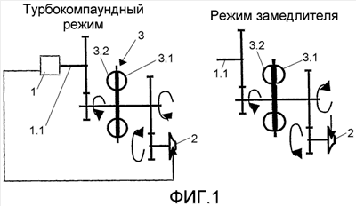 Таким образом, в варианте выполнения, изображенном на фиг.2, передача момента вращения в режиме турбосцепления от турбины 2, работающей на отработавших газах, на коленчатый вал 1.1 происходит чисто гидродинамически, в то время как в режиме замедления оба колеса – первичное колесо 3.1 и вторичное колесо 3.2 – гидродинамической муфты приводятся во вращение механически противоположно друг другу, и гидродинамическая муфта 3 выполняет функцию замедлителя встречного вращения.
