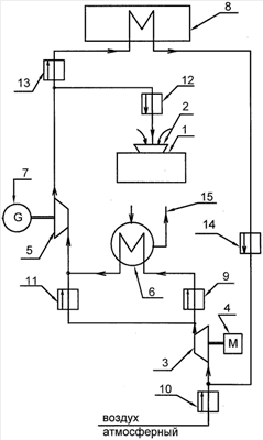 При открытом отсечном клапане 10 и закрытом отсечном клапане 14 воздух из атмосферы подается в автономный воздушный компрессор (АВК) 3, откуда нагретый воздух при открытом отсечном клапане 9 и закрытом отсечном клапане 11 подается в теплообменник 6 (тепло из которого отводится системой 15 потребителя). В теплообменнике 6 температура нагретого воздуха понижается до уровня, на несколько градусов большего температуры охлаждающей воды системы 15, и далее воздух поступает в турбодетандер 5. Вырабатываемая турбодетандером мощность отдается дополнительному электрогенератору 7. В турбодетандере 5 температура воздуха снижается до минусовой температуры. После этого холодный воздух при открытом отсечном клапане 12 и закрытом отсечном клапане 13 отводится к входному устройству 2 газотурбинной установки (ГТУ) 1. Во входном устройстве 2 этот холодный воздух смешивается с параллельно поступающим туда же атмосферным воздухом, что приводит к уменьшению средней температуры воздуха при входе в ГТУ 1 и соответственно к увеличению мощности ГТУ. Это позволяет уменьшить темп снижения мощности электрогенератора ГТУ при работе в жаркое время года, а также дополнительно компенсировать этот темп снижения выработкой электроэнергии дополнительным электрогенератором 7. Кроме того, горячая вода системы 15 (из теплообменника 6) может использоваться для нужд инфраструктуры.