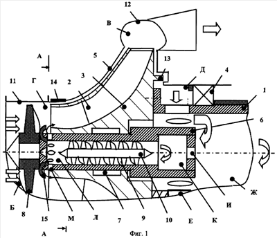 Шнекоцентробежный насос (фиг.1) содержит вал 1, который выполнен пустотелым. На валу 1 установлена крыльчатка 2 со ступицей 3. Вал 1 установлен на подшипнике 4 в корпусе 5. Дополнительный вал 6 проходит внутри вала 1 и установлен, по меньшей мере, на одном промежуточном подшипнике 7, который установлен внутри ступицы 3. На одном конце дополнительного вала 6, со стороны входа в насос, установлен шнек 8, а внутри промежуточного вала установлена и жестко с ним связана гидротурбина 9 с осью 10. К корпусу 5 подстыкованы входной корпус 11, имеющий полость «Б», и выходной корпус 12, имеющий полость «В». Между шнеком 8 и крыльчаткой 2 образована полость «Г». Со стороны заднего торца крыльчатки 2 выполнена разгрузочная полость «Д». На заднем торце ступицы 3 крыльчатки 2 выполнено заднее уплотнение 13, предназначенное для ограничения утечек перекачиваемого продукта и разгрузки осевой силы, действующей на подшипник 4. В передней части крыльчатки 2 выполнено переднее уплотнение 14. Переднее уплотнение 14 сводит до минимума утечки перекачиваемого продукта, перетекающие между корпусом 5 и крыльчаткой 2. На боковой поверхности вала 1 выполнены радиальные отверстия «Е», соединяющие разгрузочную полость «Д» и внутреннюю полость «Ж». В торце дополнительного вала выполнено отверстие «И», соединяющее внутреннюю полость «Ж» и входную полость гидротурбины «К». Выходная полость гидротурбины «Л» соединена радиальными отверстиями «М» с полостью «Г» перед крыльчаткой 2.