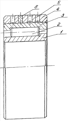 1 – внутреннее кольцо; 2 – цилиндрический ролик; 3 – наружное кольцо; 4 – дополнительное промежуточное кольцо; 5 – отверстие, заполненное легкоплавким металлом; 6 – отверстие, заполненное консистентной смазкой.