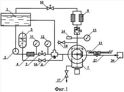 Как можно видеть на фиг.1, замкнутый контур рабочей воды содержит водяную емкость 1, соединенную трубопроводом с насосом высокого давления 2. Далее вниз по потоку установлены демпфер 3 для сглаживания колебаний давления, фильтр 4 для очистки воды от примесей, дроссельный вентиль 5 регулирования давления подачи воды, электрический трехходовой клапан 6 для направления воды высокого давления либо по байпасной линии обратно в водяную емкость 1, либо в испытательную кювету 7. На выходе из испытательной кюветы установлен настраиваемый клапан противодавления 8, выход которого соединен с блоком фильтров 9 и далее со сливным подпорным дроссельным вентилем 10. Приборное оснащение замкнутого контура включает датчик давления или манометр давления на входе 11, датчик давления или манометр 12 перед кавитирующим соплом, датчик давления или манометр 13 в испытательной кювете, датчик температуры 14 в испытательной кювете, измерительную линейку 15. В замкнутый контур рабочей воды также входят линия заполнения водой испытательной кюветы 7 с ручным вентилем 16, ручной вентиль 17 слива воды из испытательной кюветы и вентиль дренажа 18 испытательной кюветы при сливе.