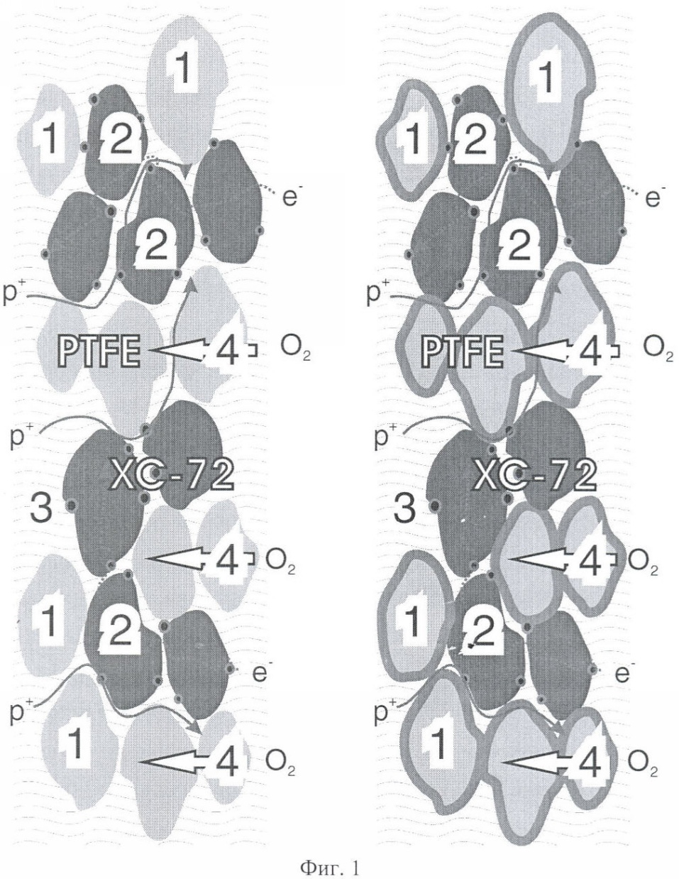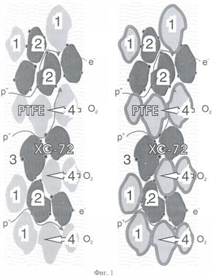 Фиг.1 изображает схему активных слоев электродов, которые имеют пористую структуру, содержат частицы фторполимера (политетрафторэтилена) – (1), содержат частицы углеродного электропроводящего носителя – сажи Vulcan XC72 (2) с нанесенными платиновыми частицами. Слева изображена схема известного активного слоя, не содержащего дополнительно олигомерную перфторсульфоновую кислоту, справа изображена схема заявляемого активного слоя, содержащего дополнительно олигомерную перфторсульфоновую кислоту, которая, в силу поверхностно-активных свойств, образует покрытие на поверхности пористой структуры активного слоя. Присутствие олигометрной перфторсульфоновой кислоты в заявляемом активном слое регулирует степень затопленности пористой структуры жидкой кислотой (3), дает вклад в транспорт протонов, улучшает транспорт кислорода (4) к платиновым частицам и ускоряет кинетику реакции восстановления кислорода на платиновых частицах.