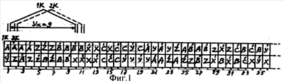 На фиг.1 показана развертка пазовых слоев предлагаемых обмоток двухобмоточного статора при z=72 (k=1), ук=9 для z/2=36 пазов с номерами пазов 1 36 снизу, катушек 1К 36К сверху с фазными зонами A-Z-B-X-C-Y слоев для 2p1=6-полюсной обмотки при q’1=2 (нечетные катушки), A’-Z’-B’-X’-C’-Y’ для 2р2=8-полюсной обмотки при q’2=3/2(чётные катушки) и сверху показаны лобовые части катушек 1К и 2К; на фиг.2 и 3 по чередованиям фазных зон фиг.1 и треугольной сетке (при ее стороне в две единицы длины) построены многоугольники МДС для 2p1=6 (фиг.2), 2р2=8 (фиг.3) с нумерацией первых q1=4 и q2=3 пазовых точек с единичными векторами токов зон A-Z-B-X-C-Y в центре. При k=2-2p1=12, 2р2=16 и z=144, а при k=3-2p1=18, 2р2=24 и z=216.