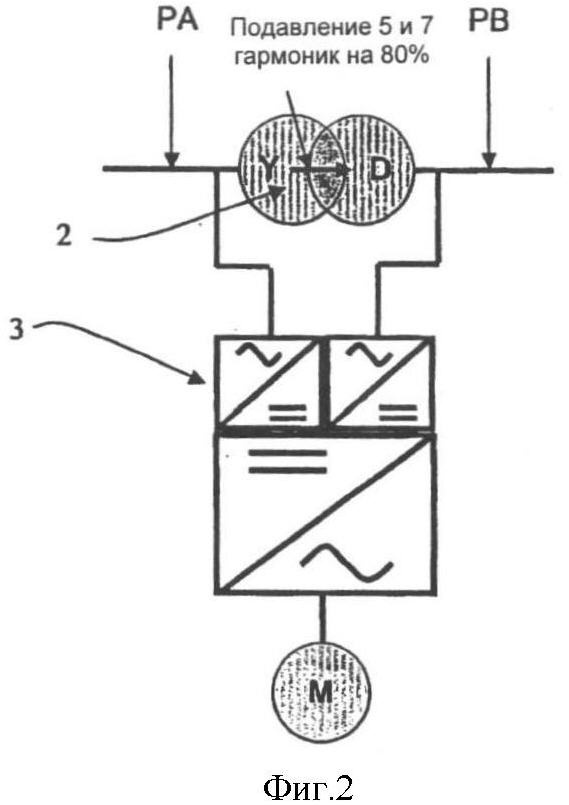 При подводке электропитания к электродвигателям, например в дизельных электрических силовых установках или в системах нагрева трубопровода на морских платформах, обычно используют выпрямительный мост, включенный в трехфазную электросеть через трансформатор, причем указанный трансформатор обеспечивает подключение двух подводов переменного тока к вводам выпрямительного моста. Однако этому решению присуща проблема, связанная с генерацией помех, включающих высшие гармоники напряжения, которые складываются с полным током нагрузки, идущим через обмотки трансформатора, что представляет собой угрозу для имеющейся электрической схемы в выпрямительном мосте и остальной электрической сети, а также увеличивает потери мощности в трансформаторе. Эта проблема особенно актуальна для 5-й и 7-й гармоник.