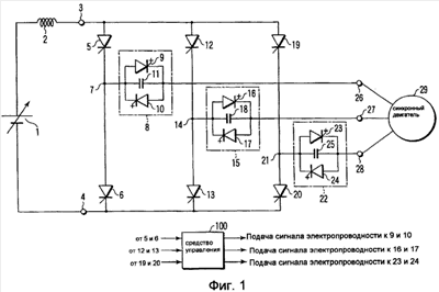 А именно, выполненное в виде блока средство 8 содействия связи подсоединено между точкой 7 присоединения тиристоров 5 и 6 и выводом 26 переменного тока. Аналогичным образом выполненное в виде блока средство 15 содействия связи подсоединено между точкой 14 присоединения тиристоров 12 и 13 и выводом 27 переменного тока. Более того, выполненное в виде блока средство 22 содействия связи подсоединено между точкой 21 присоединения тиристоров 19 и 20 и выводом 28 переменного тока. Если исключены выполненные в виде блока средства 8, 15 и 22 содействия связи, то вся структура будет аналогична структуре обычного бесколлекторного двигателя (тиристорного двигателя).