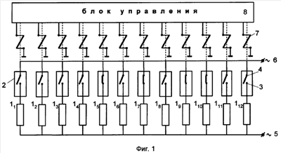 Формирование необходимой совокупности Р ДРЭ 1, обеспечивающей на выходных клеммах 5, 6 ДРЦ требуемое номинальное значение реактивности ДРЦ, обеспечивается УП 2. Положение первых 3 и вторых 4 контактов каждого УП 2 с помощью соответствующих токовых обмоток 7 определяется сигналами от блока управления 8.