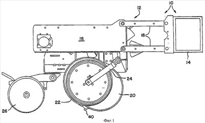 На фиг.1 и 2 изображена сеялка 10, согласно изобретению, выполненная в виде рядовой сеялки. На фиг.1 и 2 изображен отдельный рядовой высевающий аппарат 12 рядовой сеялки с несколькими рядовыми высевающими аппаратами, причем каждый рядовой высевающий аппарат 12 выполнен, в основном, идентичным и соединен с обычным держателем 14 рабочего органа. Для простоты показан лишь один рядовой высевающий аппарат 12.