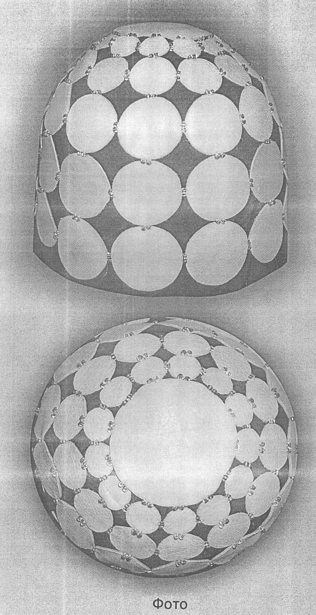 Количество вписанных элементов определяет количество горизонтальных рядов. Размер каждого матричного элемента определяет размер элементов в соответствующем горизонтальном ряду (фиг.3). Верхняя малая часть клина будет являться частью шаблона верхушки головного убора, представляющей окружность радиусом, равным расстоянию от верхней точки клина до крайней точки контура последнего матричного элемента (фиг.3). По полученным шаблонам выкраивают элементы каждого размера количеством N, а также верхушку. Соединение элементов производится через соединительные отверстия по горизонтальным рядам, начиная от верхушки и до нижнего ряда (фиг.4).