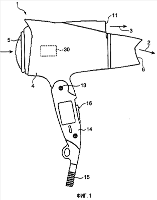 фиг.1 – боковая проекция внешнего вида ионного фена для волос согласно первому варианту осуществления изобретения;