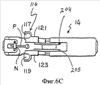 При полном сжатии картриджа 14 происходит прокалывание уха, а штырь серьги Р сцепляется с гайкой N. Затем давление руки на картридж 14 (или на заряжаемый картриджем серьги пистолет для пуссет) ослабляют, половинки 113 и 115 картриджа серьги для пирсинга ушей открываются вверх по направлению от серьги Е для пирсинга ушей, гайка N серьги для пирсинга ушей отсоединяется от зажима 114 для гайки, ухо уже проколото, и затем пистолет для пуссет с картриджем серьги может быть удален вместе с картриджем серьги из области, прилегающей к проколотому уху. Вследствие того, что осуществляется удержание оконечных частей 125 и 127, как показано на фиг.6С, половинки 113 и 115 держателя пуссеты не выпадают и тем самым предотвращают повторную загрузку картриджа, нарушающую стерильность. То есть прямоугольные выступы на концах оконечных частей 125 и 127 удерживают половинки картриджа 113 и 115 с предотвращением их выпадения для того, чтобы предотвратить повторную загрузку пуссеты и повторное использование картриджа серьги.
