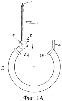 В общем на чертежах показаны конструкция и работа устройства для пирсинга ушей по данному изобретению. Из фиг.1А следует, что кольцевая шарнирная серьга по данному изобретению содержит кольцо 3 пуссеты, которое имеет первую концевую часть 6А и вторую концевую часть 6В. Шарнирная кольцевая серьга дополнительно содержит штырь 1 пуссеты, который имеет первый заостренный конец 9 и второй конец 8, окружающий отверстие 5, шарнир 4, прикрепленный к первой концевой части 6А кольца 3 пуссеты, и защелку 2, прикрепленную ко второй концевой части 6В кольца 3 пуссеты. Как показано на фиг.1С, защелка 2 представляет собой U-образный элемент, выполненный с возможностью размещения штыря 1 пуссеты, который защелкивается на место при проталкивании в защелку 2. Расстояние между двумя плечиками защелки 2 несколько меньше диаметра штыря 1 пуссеты, но эти плечики изгибаются при проталкивании через них штыря 1 пуссеты, что вызывает защелкивание штыря 1 пуссеты в неподвижном положении. На фиг.1А показана шарнирная кольцевая серьга в открытом положении, а на фиг.1В – в закрытом положении. Для перехода из открытого положения в закрытое защелка 2 и штырь 1 пуссеты совершают вращательное перемещение друг относительно друга вокруг шарнира 4 до тех пор, пока штырь 1 пуссеты не защелкнется в защелке 2. На фиг.2 показаны дополнительные детали шарнира 4. Из фиг.1D видно, что шарнир 4 содержит два, по существу, плоских вертикальных элемента 10. Второй конец 8 штыря 1 пуссеты шарнирно закреплен между вертикальными элементами 10 посредством шарнирного пальца 7, который проходит через отверстие 5 штыря 1 пуссеты и прикреплен к любому концу вертикальных элементов 10, благодаря чему штырь 1 пуссеты и кольцо 3 обладают свободой поворота вокруг оси шарнирного пальца 7.