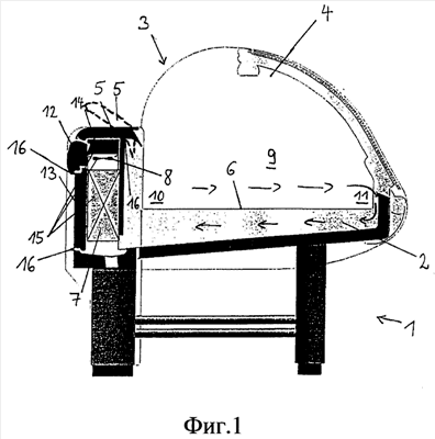 Охлаждающее устройство 7 предназначено для охлаждения потока воздуха, который должен охлаждать товары, выложенные на витринной платформе 6. Для этого охлаждающее устройство 7 соединено с вентилятором 8, являющимся вентиляционным устройством, направляющим в заданном направлении поток холодного воздуха, который входит в пространство 9 над витринной платформой 6 с задней стороны 10 основной витрины 2, течет к фронтальной стороне 11 или к стороне покупателя основной витрины 2 и течет обратно к задней стороне под витринной платформой, дополнительно охлаждая ее нижнюю часть. Этот поток на фиг. 1 показан стрелками. Рабочая платформа 5, а также первая крышка 12 и вторая крышка 13 здесь показаны в закрытом положении. Стерилизующее устройство 14 расположено на вершине модуля 15. Модуль 15 содержит охлаждающее устройство 7, вентиляционное устройство 8 и стерилизующее устройство 14. Воздух, охлажденный охлаждающим устройством 7, которое содержит испаритель и теплообменник, нагнетается вентилятором 8 для создания потока в определенном направлении, и поток течет через стерилизующее устройство 14 для уничтожения бактерий, присутствующих в охлажденном воздухе. В этом примере для стерилизации охлажденного воздуха используется УФ-камера. Поток охлажденного воздуха прогоняется через УФ-камеру, где он подвергается воздействию ультрафиолетового излучения, которое убивает большинство бактерий.