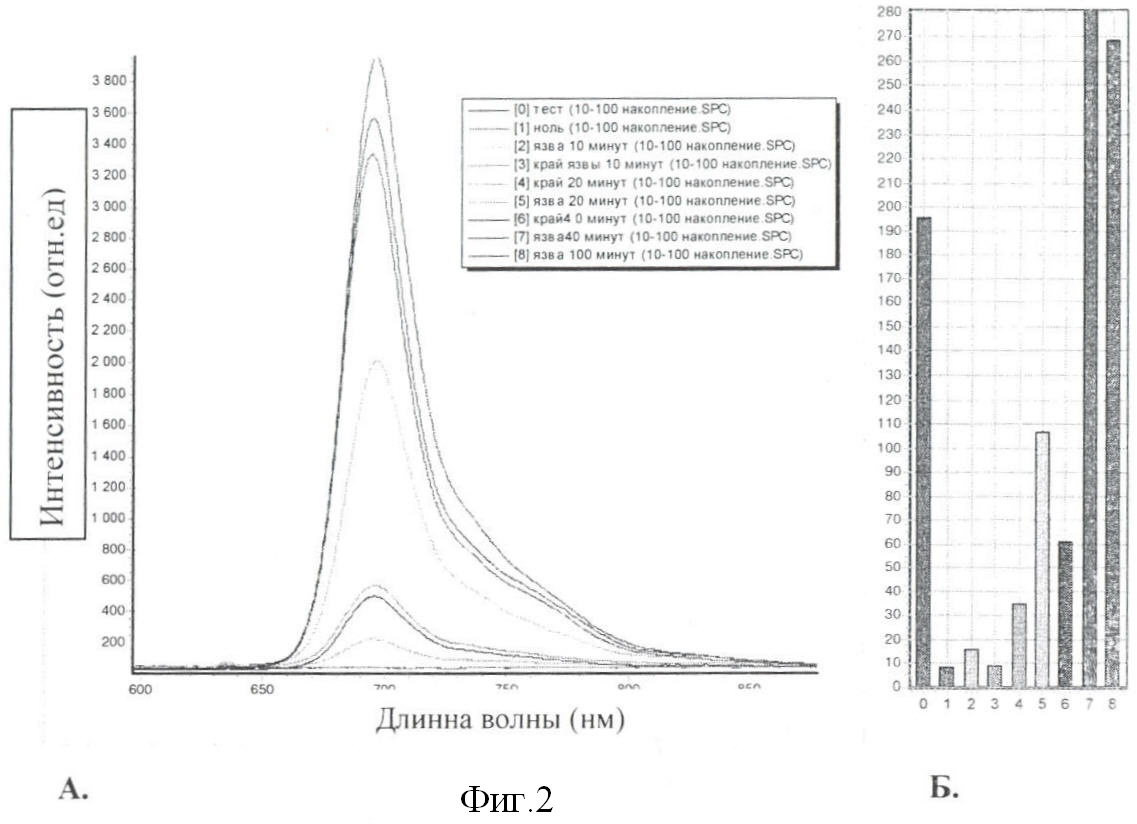 Регистрацию спектров проводили троекратно в каждой выбранной точке интереса на роговице. Полученные спектры выводятся на экран монитора. На фигуре 2 представлены спектры флюоресценции ФС в зоне кератомикоза и интенсивность флюоресценции (А) и интегральная интенсивность флуоресценции соответствующих спектров (Б). Как видно на изображении, в зоне кератомикоза интегральная интенсивность флюоресценции составляет 280-270 отн.ед., что значительно превышает интегральную интенсивность в зоне здоровой ткани по краю язвы – 60 отн.ед.