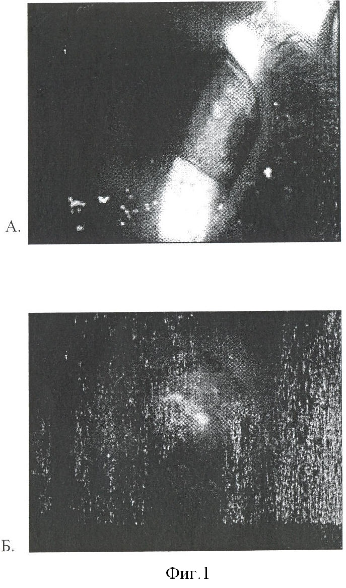 Кролику с моделированным кератитом нанесли на поверхность роговицы гель с содержанием октакатионного фталоцианина (ZnPcCholin8) в концентрации 1 мг/мл. Через 30-40 минут излишки смывают водой или физиологическим раствором. Затем проводят видеофлуоресцентную диагностику кератита с использованием лазерной установки для фотодинамической терапии ЛФТ-630/675-01 «Биоспек» На фигуре 1 представлены цветное (А) и флуоресцентное (Б) изображения зоны кератомикоза кролика. На флюоресцентном изображении видно, что истинная зона поражения превышает патологический участок на цветной фотографии. Причем чем глубже зона поражения (в центре патологического очага), тем выше интенсивность флюоресценции.