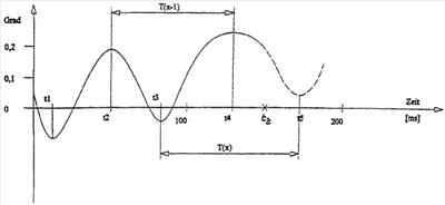 При ответе на поставленный выше вопрос об увеличенном статистическом среднем значении длительности цикла следует учитывать, что момент появляющегося сигнала принадлежит как периоду между соседними максимумами, так и периоду между соседними минимумами. Длительности этих периодов можно интерпретировать как результат взаимных нагружений взаимосвязанных осцилляторов. Тогда разность длин названных периодов характеризует изменение вероятности появления случайного события всегда во второй энергетической части последующего периода по сравнению с вероятностью его появления во второй энергетической части предшествующего периода. Следовательно, признаки управления изменениями вероятности для «захвата» ожидаемого события структурами колебания следует искать в разности длительности не общих частей, которые меньше чем период. Похожим образом время инверсии для time invariance” теста выбирают в пределах временного интервала между локальным максимумом и предшествующим локальным минимумом, чтобы получить высшее значение асимметрии и по величине асимметрии различать принадлежность стратегии процессов формирования волн к определенным треморам (G.Deuschl u.a.: Tremor classification and tremor time series analysis, Chaos, Nr.5(1), S.48-52, 1995).