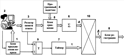 2. Устройство для осуществления способа, охарактеризованного в п.1, содержащее блок предъявления вопроса, управляемый испытуемым, регистр памяти ответа испытуемого, программный задатчик, блок сравнения, сумматор, таймер и блок регистрации, в котором первый вход блока сравнения соединен с информационным выходом регистра памяти ответа испытуемого, второй вход блока сравнения соединен с выходом программного задатчика, вход сумматора соединен с выходом блока сравнения, отличающееся тем, что оно дополнительно содержит RS-триггер и блок умножения, при этом R-вход RS-триггера связан с управляющим выходом регистра памяти ответа испытуемого, S-вход RS-триггера связан с управляющим выходом блока предъявления вопроса, выход RS-триггера подключен к управляющему входу таймера, первый вход блока умножения связан с выходом сумматора, второй вход блока умножения связан с выходом таймера, а выход блока умножения подключен к входу блока регистрации.