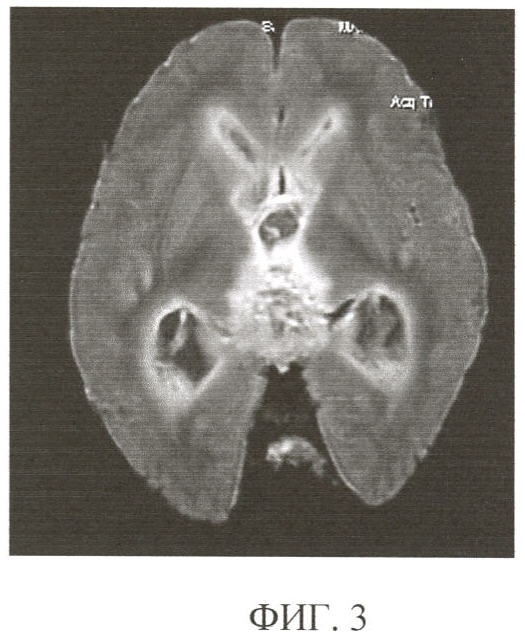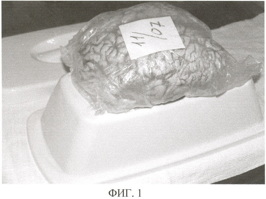 Через месяц проводят МРТ макропрепарата фиксированного головного мозга. Для этого используют головную катушку магнитно-резонансного томографа напряженностью магнитного поля не менее 1,5 Тесла. Макропрепарат головного мозга помещают в полиэтиленовый пакет и размещают на специальную подставку высотой 15-20 см основанием головного мозга книзу (фиг.1). Используется подставка из материала, который не создает артефакты на МРТ изображениях, например, поролона или пластмассы.