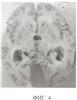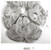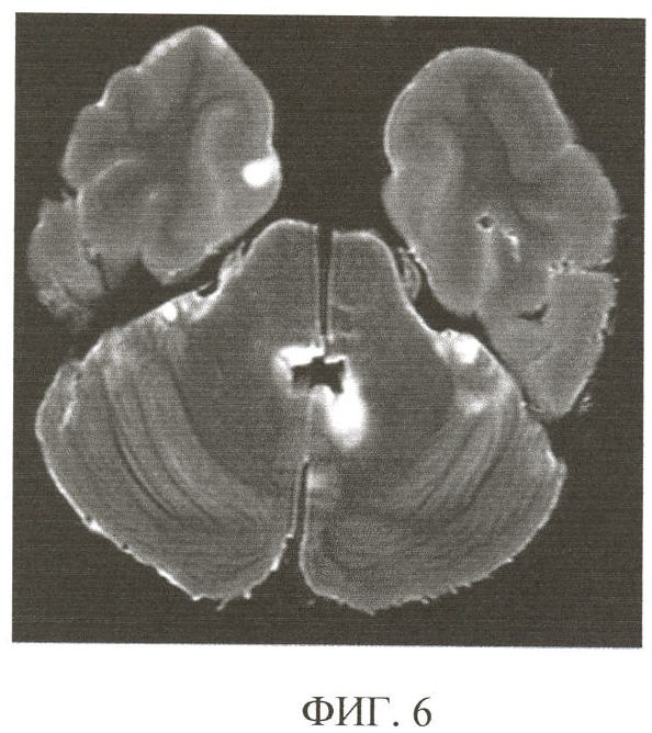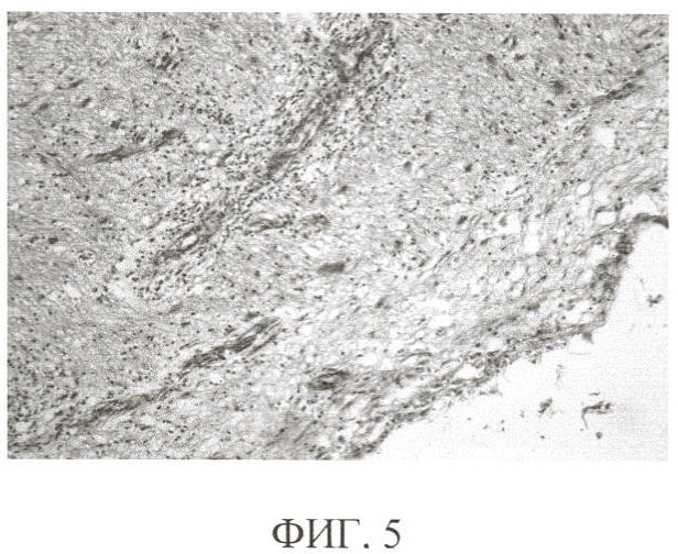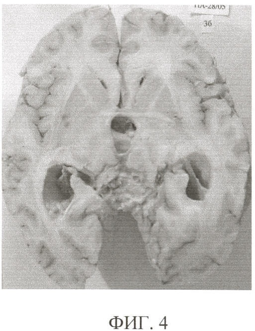 Пример 1. Пациенту (И.б. 1812-05, РНХИ) 19 лет была произведена трепанация черепа по поводу герминомы области шишковидной железы. В послеоперационном периоде течение заболевания осложнилось присоединением гнойных инфекций и развитием гидроцефалии. Несмотря на проводимое интенсивное лечение больной скончался с явлениями нарастания очаговой и общемозговой симптоматики, причина которых не была до конца ясна. Согласно заявляемому способу при МРТ с импульсной последовательностью Inversion Recovery (фиг.3) абсолютно идентично макропрепарату определяется опухолевый узел, расширенная желудочковая система, внутрижелудочковые наложения, обусловленные наличием вентрикулита. Кроме того, посмертная МРТ выявляет перивентрикулярное свечение, в то время как субэпендимальные отделы белого вещества на макропрепарате выглядят неизмененными (фиг.4). Прицельное гистологическое исследование зон гиперинтенсивного магнитно-резонансного сигнала в веществе головного мозга вокруг желудочков выявило распространение воспалительного процесса с развитием энцефалита с обильной лимфоплазмоцитарной инфильтрацией и отечными изменениями белого вещества мозга (фиг.5).