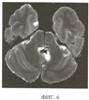Использование Т1 ВИ, Т2 ВИ, ИП IR при МРТ позволяет выявить и дифференцировать патологические процессы различной этиологии. МРТ изображения в коронарной и сагиттальной плоскости необходимы для точного последующего расположения аксиальных срезов, а также для получения трехмерной картины локализации и распространенности патологического процесса. Поэтому в этих двух сериях изображение получают в Т2 ВИ толщиной среза 5 мм, что достаточно для ответа на поставленную задачу и позволяет сократить время исследования (время выполнения 2-3 мин). Толщина срезов 2 мм в аксиальной плоскости улучшает разрешающую способность исследования, позволяет получить информативные изображения и выявить мелкие очаги поражения головного мозга. Срезы ориентируют в аксиальной плоскости в соответствии с межкомиссуральной системой координат. Соблюдение последнего условия позволяет при дальнейшем патологоанатомическом исследовании добиться идентичности МРТ изображений и анатомического среза для проведения сопоставления. Получение идентичных срезов дает возможность прицельного забора (вырезки) измененных участков для гистологического исследования, достоверно и точно осуществить диагностику.