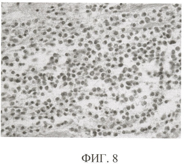 Пример 2. Б-ная (И.б. 2700-06, РНХИ) 26 лет была прооперирована по поводу астроцитомы спинного мозга на уровне Th1-7. В дальнейшем на фоне нарастания неврологической симптоматики при проведении МРТ головного мозга признаки объемного очагового поражения отсутствовали. Причины клинического ухудшения вплоть до момента смерти не были ясны. Согласно заявляемому способу при посмертной МРТ головного мозга обнаружен опухолевый субстрат, выстилающий стенки IV желудочка, его сигнальные характеристики соответствовали ликвору: гиперинтенсивный на Т2 ВИ, гипоинтенсивный на Т1 ВИ. Кроме того, выявляются лептоменингеальные мелкие очаги преимущественно в задней черепной ямке (фиг.6). При макроскопическом исследовании солидная ткань опухоли представляет собой бугристые разрастания в полости IV желудочка, но изменения оболочек мозжечка не определяются (фиг.7). При гистологическом исследовании очагов измененного МРТ сигнала на оболочках мозга выявлены метастазы полиморфноклеточной глиобластомы (фиг.8).