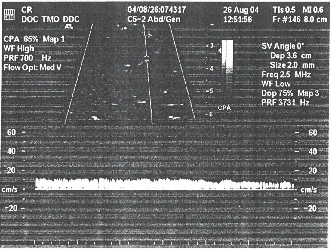 Больной Н., 36 лет, выполнена трепанбиопсия печени по поводу хронического вирусного гепатита С. На приведенной эхограмме (см. чертеж) в режиме энергетического допплеровского картирования визуализируется ток жидкости (крови) по пункционному каналу. В режиме импульсной допплеровской спектрографии потока получена спектрограмма, по ее форме установлено венозное кровотечение.