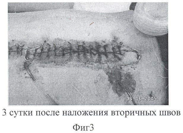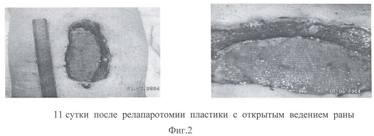 Однако результаты этих операций далеки от удовлетворительных. Частота рецидивов очень высока. Это связано с тем, что сшиваемые края дефекта брюшной стенки всегда инфильтрированы вследствие гнойного воспаления, часто наблюдается некроз тканей. Парез кишечника и увеличенное внутрибрюшное давление препятствует сближению краев раны без натяжения. Известный способ не может в полной степени обеспечить надежность укрепления брюшной стенки, надежную герметизацию брюшной полости и предотвратить реэвентрацию. В связи с этим существует опасность развития перитонита, межпетельных гнойников, кишечных свищей. Способ не позволяет иссечь инфильтрированные и некротизированные участки раны, вследствие чего значительно уменьшается надежность наложенного шва, создаются условия для его прорезывания и рецидива эвентрации.