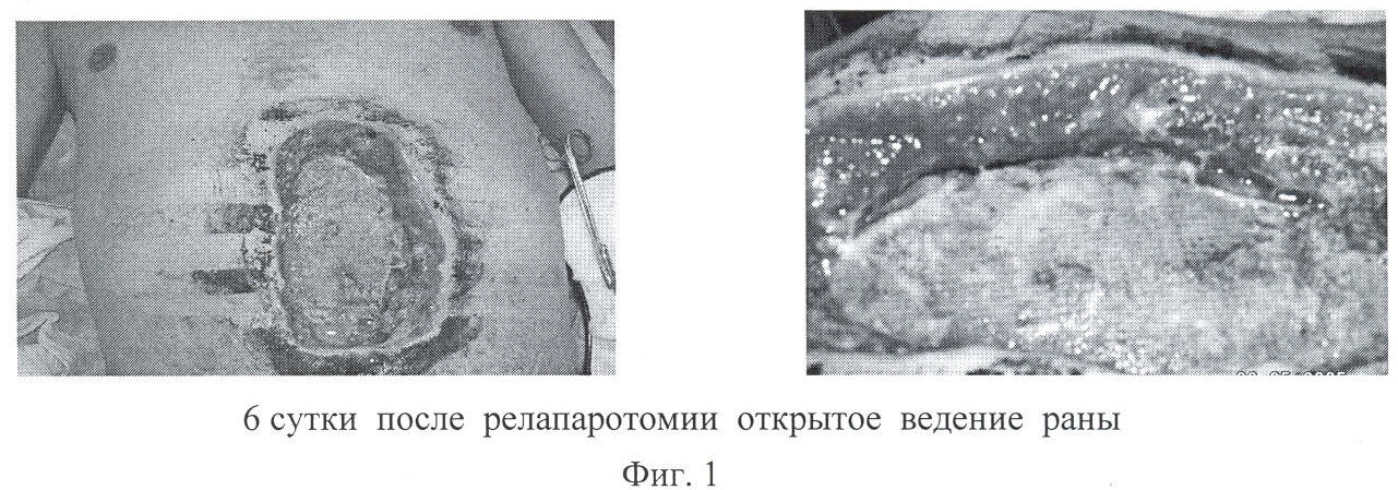 Применяемый полипропиленовый сетчатый эндопротез обладает механической прочностью, биологической и химической инертностью, не вызывает реакции отторжения и воспаления, легко стерилизуется. Способ фиксации эндопротеза обеспечивает каркасную функцию брюшной стенки за счет большей площади эндопротеза и надежность укрепления передней брюшной стенки, что позволяет вести более активно больных в послеоперационном периоде и избежать формирования грыж в отдаленном периоде. Применение эндоскопической скорняжной иглы и способа завязывания узлов с погружения под кожу позволяет избежать прорезывания кожных швов. Эндопротез отделяет брюшную полость от лапаротомной гнойной раны. Открытое ведение послеоперационной раны дает возможность контролировать течение раневого процесса, производить хирургическую обработку раны, что способствует сокращению первой фазы раневого процесса, раннему появлению грануляций, позволяет снизить внутрибрюшное давление за счет увеличения объема брюшной полости путем создания дополнительного пространства.