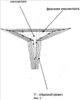 После выделения грыжевого мешка и окончания манипуляции с ущемленными органами (резекции кишки, рассечения спаек и т.д.) приступают непосредственно к протезированию задней поверхности передней брюшной стенки. При этом сетку фиксируют по ее нижнему краю к лонному бугорку, Куперовой связке и m. psoas. Верхний край сетки фиксируют к поперечной фасции. Поскольку Т-образный разрез в данном случае является послабляющим, его края не сшиваются друг с другом во избежание натяжения, а фиксируют к проленовому имплантату (фиг.2).