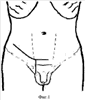 Способ осуществляется следующим образом: на 3,0 см выше лона косопоперечным разрезом длиной 12,0 см от наружного края прямой мышцы живота в направлении верхней передней подвздошной ости рассекают кожу, подкожно-жировую клетчатку, апоневроз. Визуализируют предбрюшинное пространство и ущемляющее кольцо. В любом удобном месте вскрывают брюшину и визуализируют ущемленный орган. Затем продолжают разрез в виде Т-образного (при необходимости с переходом на мошонку), рассекая “на 12 часах” кожу, подкожно-жировую клетчатку, апоневротически-фасциальный комплекс, мышцы, через ущемляющее кольцо, высвобождая тем самым содержимое грыжевого мешка (фиг.1) Далее оценивают жизнеспособность ущемленного органа, при необходимости выполняют его резекцию.