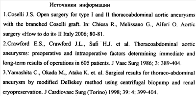 CRAWFORD E.S., et al. Thoracoabdominal aortic aneurysms: preoperative and intraoperative factors determining immediate and long-term results of operations in 605 patients. J Vase Surg 1986; 3:389-404. SU 1528459 A1, 15.12.1989. RU 94026960 A1, 27.08.1996. БЕЛОВ Ю.В. Руководство по сосудистой хирургии с атласом оперативной техники. – М.: ДеНово,2000, с.349, 361-369. БУРАКОВСКИЙ В.И. и др. Сердечно-сосудистая хирургия. – М.: Медицина, 1996, с.767.