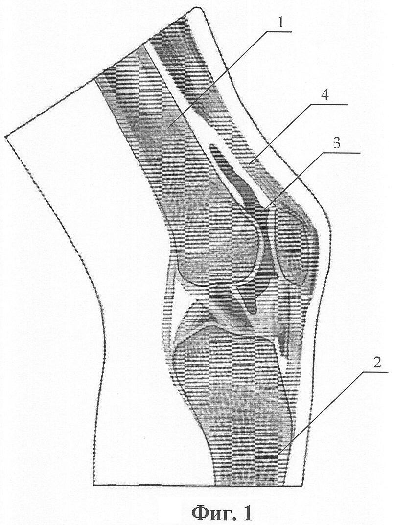 На фигуре 1 показан коленный сустав в боковой проекции, где 1 – бедренная кость; 2 – большеберцовая кость; 3 – заворот; 4 – ложе сухожилия четырехглавой мышцы бедра.