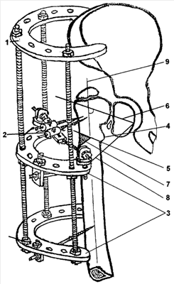 На чертеже представлен проксимальный отдел бедренной кости с варусной деформацией шейки бедренной кости и наложенным аппаратом для ее коррекции.