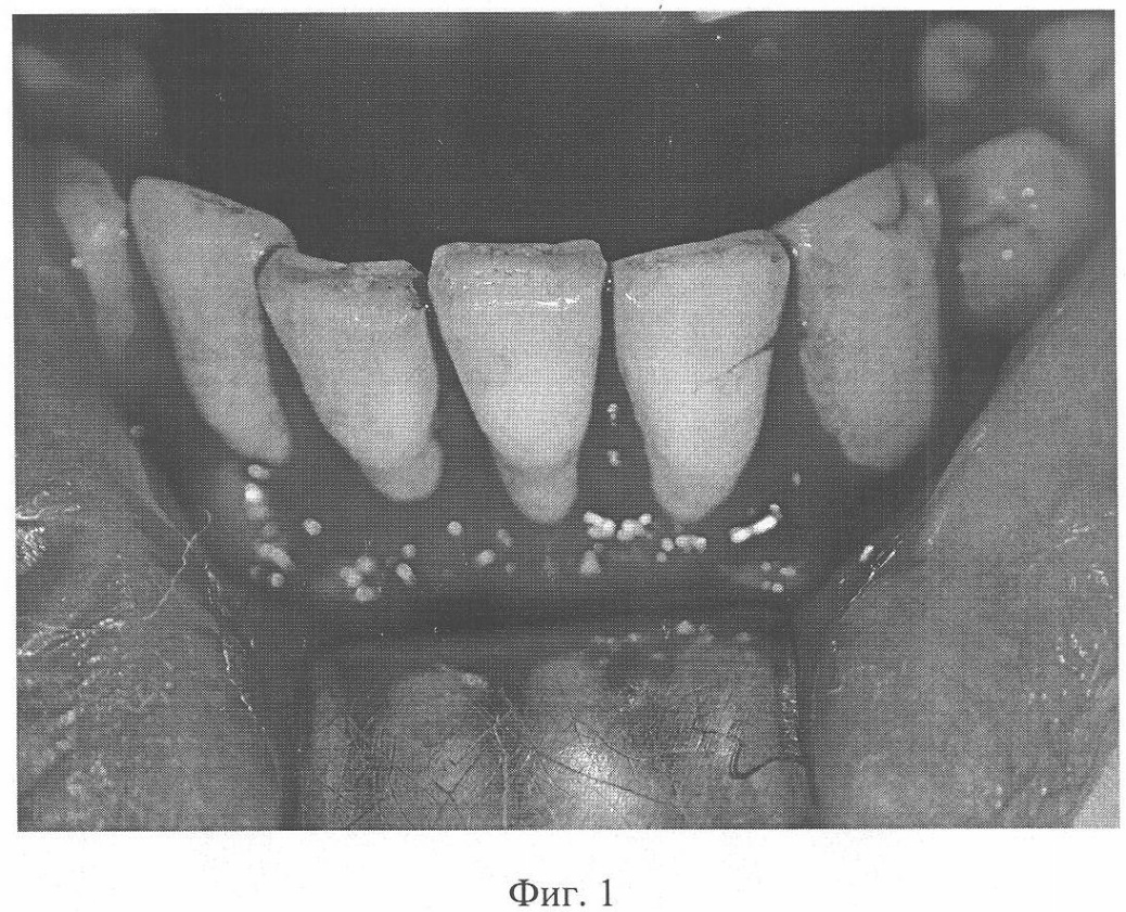Недостатком известного способа является неполное восстановление тканей пародонта из-за отсутствия мероприятий, направленных на нормализацию реологических свойств крови, что отрицательно сказывается на состоянии трофики альвеолярных отростков челюстей, в виду чего нарушается репаративный остеогенез.