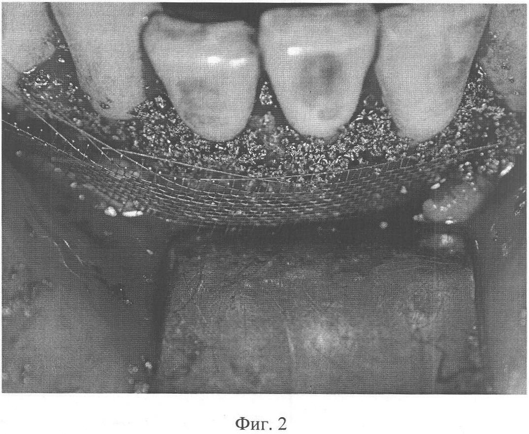 На фиг.1 изображено состояние альвеолярной части нижней челюсти больной Н. после удаления патологических тканей; на фиг.2 – состояние альвеолярной части нижней челюсти больной Н. после замещения костных изъянов мелкогранулированным пористым никелидом титана и установки тонкопрофильной тканевой системы поверх имплантационного материала.