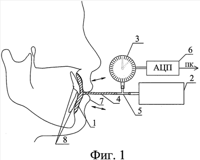 Полый эластичный корпус 1 помещают в ротовую полость пациента между губами 7 и зубами 8 обследуемой области преддверия полости рта при полностью или не полностью сомкнутых зубах. Пациент при этом должен удерживать эластичный корпус 1 губами так, чтобы губы соприкасались между собой. Затем с помощью устройства 2, нагнетающего газ или жидкость, в качестве которого могут быть использованы компрессор, баллончик со сжатым газом или резиновая груша, в полом эластичном корпусе 1 поэтапно изменяют величину давления. Пациент при этом оказывает сопротивление возрастающему давлению мышцами, окружающими ротовую щель. Возникающее избыточное давление фиксируется измерительным прибором 3, в качестве которого может быть использован обыкновенный монометр или любой прибор, измеряющий давление. Показания прибора с помощью АЦП 6 могут быть преобразованы и выведены в виде сигнала на дисплей компьютера.