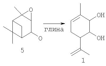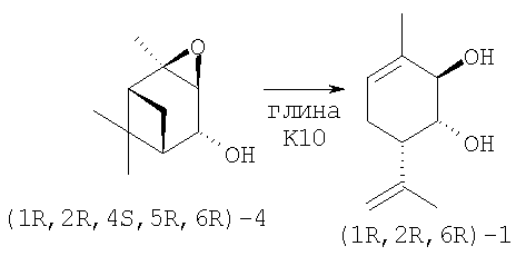 =-44 (с 12, CHCl3)) в 150 мл СН2Cl2. Реакционную смесь перемешивают 1 ч при 22°С. Катализатор отфильтровывают, промывают этилацетатом, растворитель отгоняют. Остаток делят колоночной хроматографией на силикагеле, элюент – раствор этилацетата в гексане от 5 до 100%. Получают 5.10 г (44%) (1R,2R,6S)-3-метил-6-(проп-1-ен-2-ил)циклогекс-3-ен-1,2-диола ((1R,2R,6S)-1) (