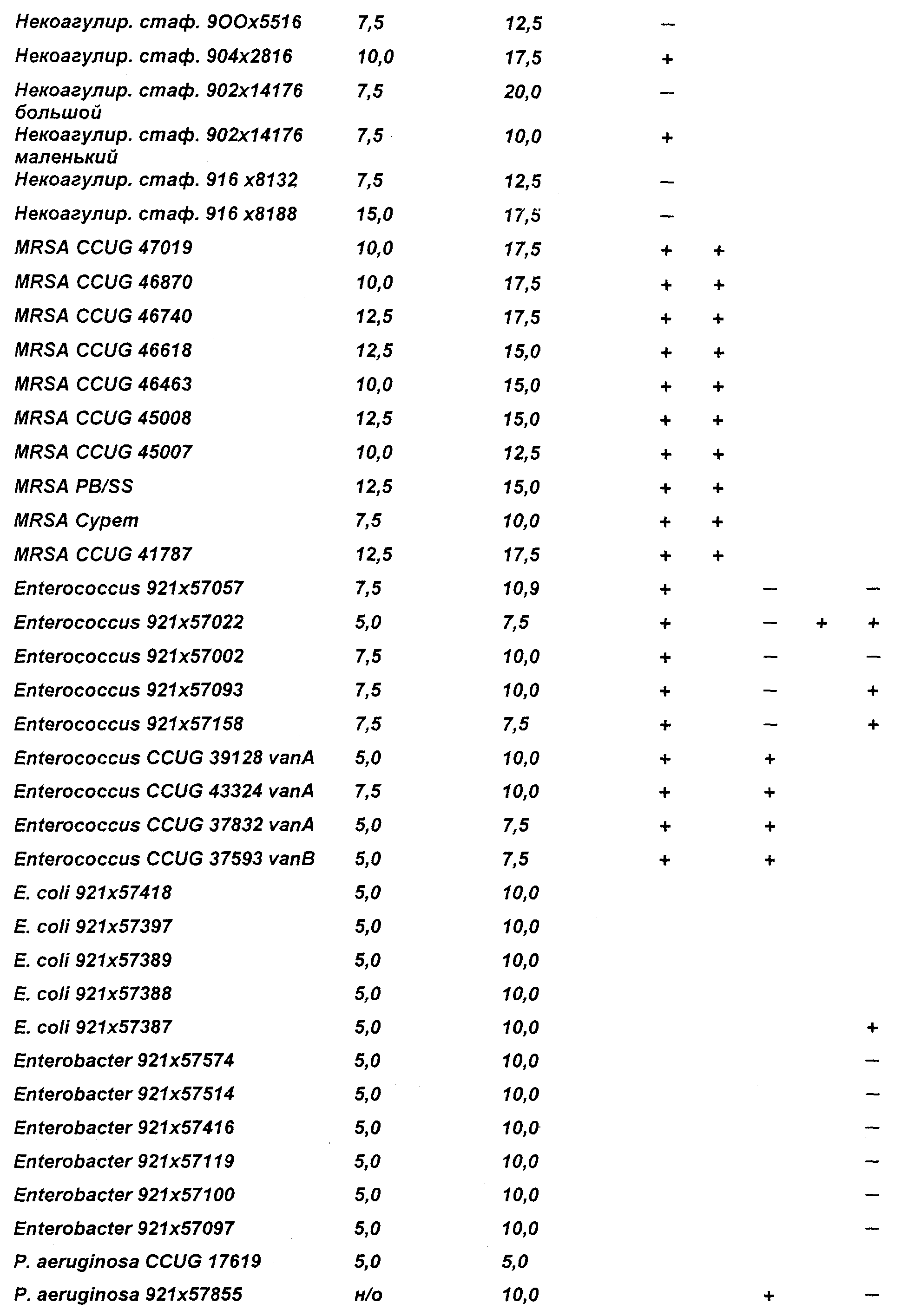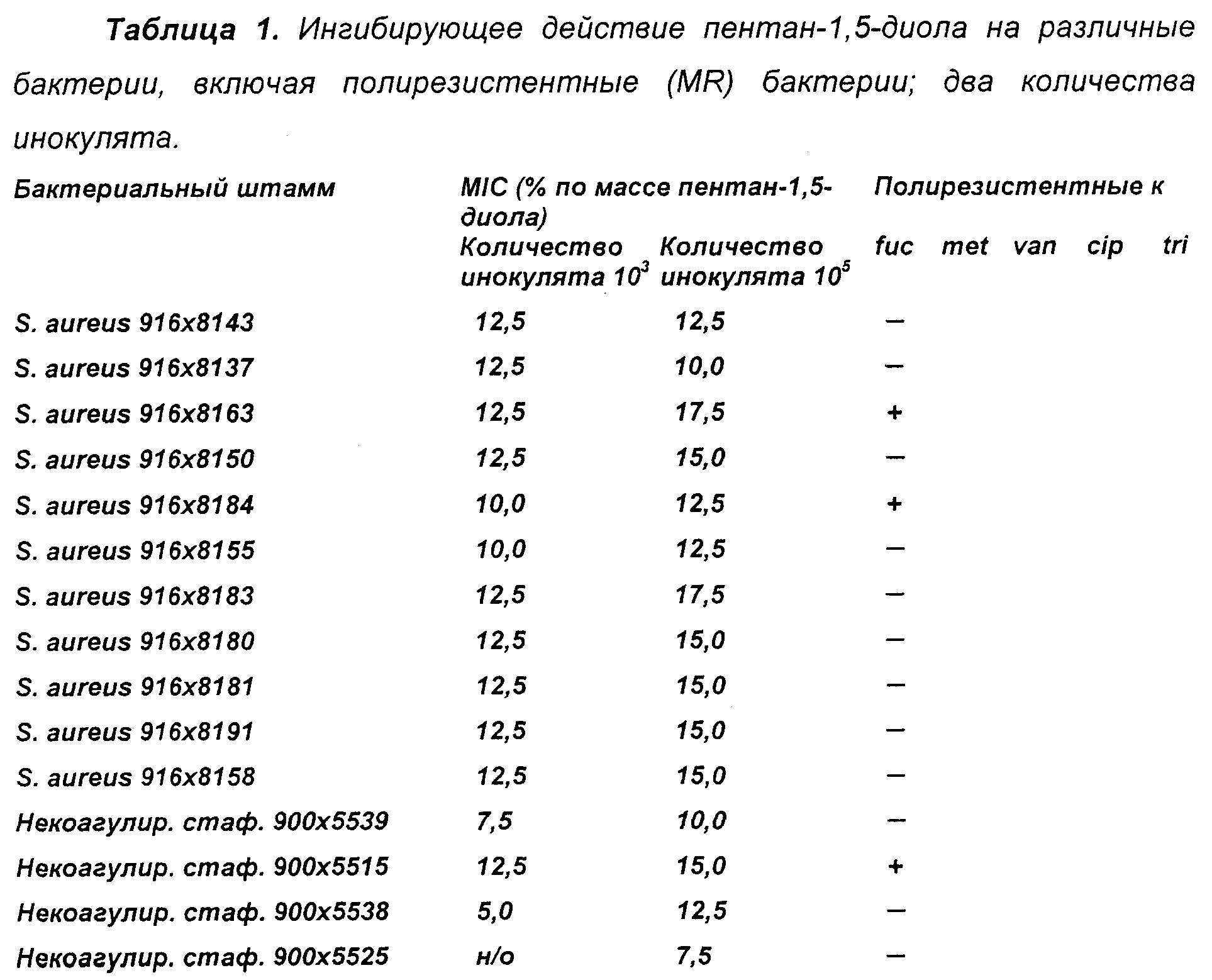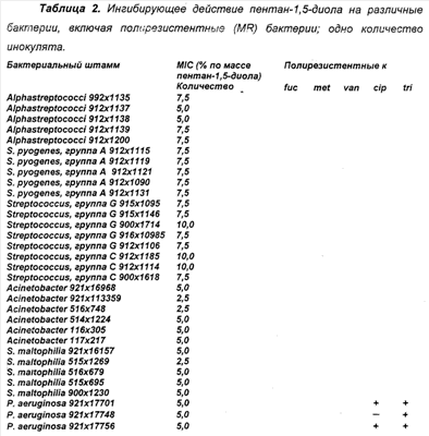Определение ингибирующей активности пентан-1,5-диола в отношении бактерий. Минимальную ингибирующую концентрацию (MIC) пентан-1,5-диола в отношении ряда бактерий определяли с помощью стандартной методики разведении в кровяном агаре (24 часа, 37°С). Образцы агара с концентрациями пентан-1,5-диола, увеличивающимися последовательно на 2,5% по массе, готовили путем смешивания компонентов при температуре выше температуры застывания агара перед его застыванием. Исследовали следующие бактерии: метициллин-резистентный Staphytococcus aureus (MSRA), S.aureus, резистентный к фузидиевой кислоте, нерезистентный S.pyogenes, некоагулирующие стафилококки (резистентность см. ниже в Таблице 1), ванкомицин-резистентные энтерококки (Enterococcus CCUG van А и van В), нерезистентные штаммы Escherichia coli, Acinetobacter, резистентный к цефадроксилу, нитрофурантину, мециллинаму, Serrafia maltophilia, резистентный к большинству типов антибиотиков, Enterobacter (резистентность см. ниже в Таблице 1; дополнительно резистентный к цефадроксилу и нитрофурантину), нерезистентные -стрептококки, нерезистентный Streptococcus группы G, Pseudomonas aeruginosa (резистентность см. ниже в Таблице 2). Использовали инокуляты, содержащие 103 и 105 бактерий. Между этими инокулятами не наблюдали существенного различия. Это показывает, что ингибирующее действие пентан-1,5-диола по существу не зависит от количества инокулята, что отличается от поведения большинства традиционных антибиотиков. Эти результаты представлены в Таблицах 1 и 2; показана резистентность только к выбранным антибиотикам.