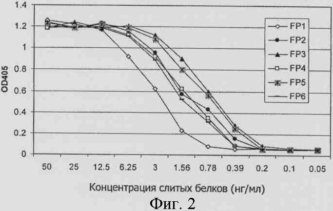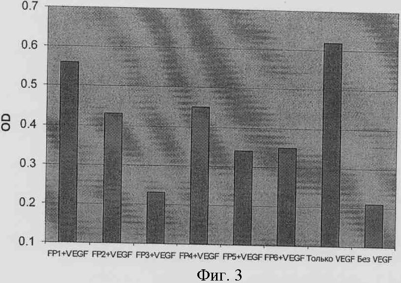 Как показано на фигуре 2, все пять химерных белков, сконструированных и экспрессированных в воплощениях настоящего изобретения, были способны к связыванию с VEGF и обладали лучшей аффинностью по сравнению с прототипом FP1. Определяли связывание при концентрациях ниже, чем 1 мкг/мл. Предпочтительно FP3 обладал наилучшей аффинностью и был лучшим ингибитором VEGF. Его концентрация для полумаксимального связывания была примерно в 5 раз ниже, чем у FP1. FP5 обладал немного меньшей аффинностью к