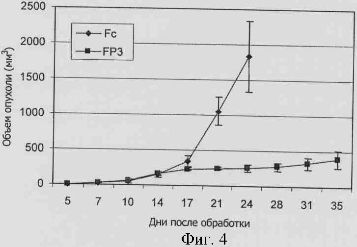В качестве животной модели выбирали мышей с клетками меланомы B16F10, которая является разновидностью быстро растущих опухолевых клеток. В эксперименте мышам линии BALB/C nude сначала вводили подкожно в заднюю часть 1×105 клеток B16F10 в 0,05 мл. Затем очищенный химерный белок вводили внутрибрюшинно в количестве 400 мкг на каждую мышь (средний вес мыши – 22 г) два раза в неделю. Мышам, служившим негативным контролем, вводили такое же количество очищенного иммуноглобулинового Fc-фрагмента человека. Кривые роста опухолей, приведенные на фигуре 4, указывают на то, что химерный белок FP3 эффективно ингибировал рост меланомных клеток (Р<0,01).