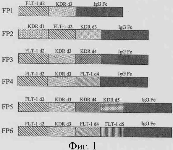 Фигура 1 демонстрирует структуры пяти химерных белков в соответствии с предпочтительным воплощением настоящего изобретения и структуру FP1, прототипа, известного ранее в этой области техники. Они сконструированы с помощью различных фрагментов FLT-1, KDR и иммуноглобулинового Fc-участка, используя генно-инженерные технологии.