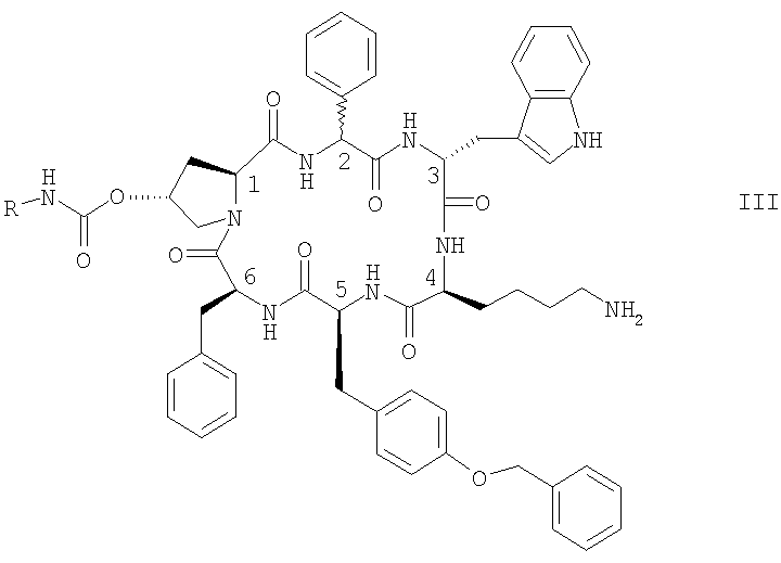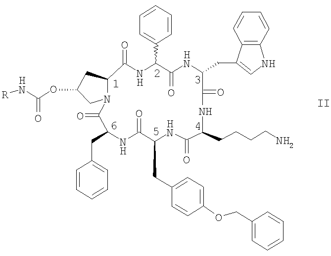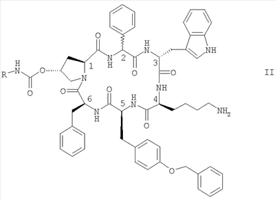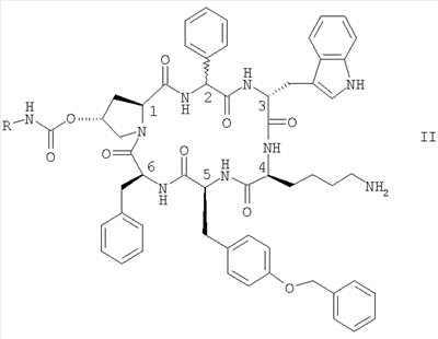 Предпочтительно R обозначает NR1R2-C2-6алкилен. Предпочтительные соединения формулы II обозначают соединения, в которых R обозначает 2-аминоэтил, а именно цикло[{4-(NH2-C2H4-NH-CO-О-)Pro}-Phg-DTrp-Lys-Tyr(4-Bzl)-Phe] (упоминается в настоящей заявке как соединение А) и цикло[{4-(NH2-C2H4-NH-CO-О-)Pro}-DPhg-DTrp-Lys-Tyr(4-Bzl)-Phe], в свободной форме, в форме соли или в защищенной форме. Phg обозначает -HN-СН(С6Н5)-СО- и Bzl обозначает бензил.