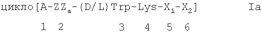 Х2 обозначает -аминокислоту, имеющую ароматический остаток в боковой цепи С , или аминокислотную единицу, выбранную из Dab, Dpr, Dpm, His, (Bzl)HyPro, тиенил-Ala, циклогексил-Ala и тетра-бутл-Ala, остаток Lys в указанной последовательности соответствует остатку Lys9 в нативном соматостатине-14.