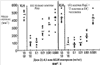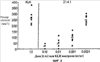 Как показано на фиг.3, количество 21.4.1, которое вызывает 50%-ное ингибирование опухолевого роста в присутствии иммунных клеток, составляло 0,02 мг/кг и соответствовало концентрации в сыворотке Сmax равной 0,2 мкг/мл. Когда опухолевые клетки инъецировали совместно с иммунными клетками, количество 21.4.1, необходимое, чтобы вызвать 50%-ное ингибирование опухолевого роста, уменьшалось в 20 раз до 0,001 мг/кг (Сmax концентрация в сыворотке = 0,01 мкг/мл).